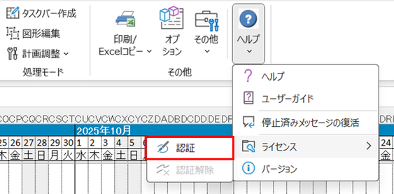 - リボンのヘルプ、ライセンスのクリックし、「認証」または、「認証解除」を選択する。
